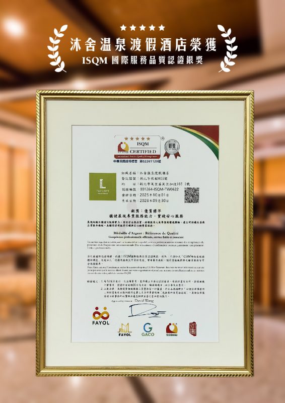 沐舍溫泉渡假酒店榮獲 ISQM 國際服務品質認證 銀獎 殊榮,服務品質獲得國家級與國際標準的雙重肯定。